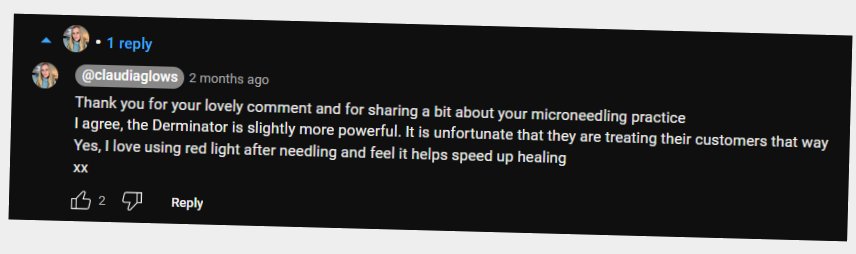 Claudia then started to regularly mention in her YouTube videos that she uses the Derminator but "I must warn that the company has questionable, unethical business practices, not honoring their warranty and being rude so buyer beware".