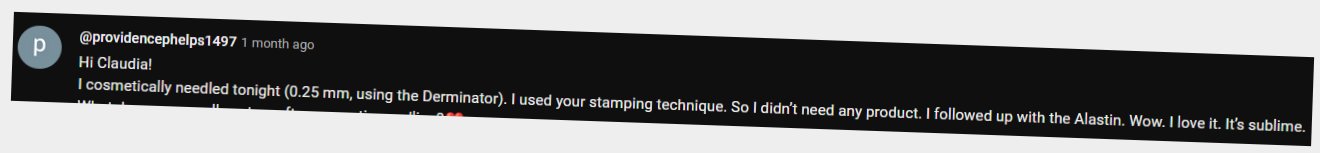 The funny thing is that the comments underneath her defamatory video all agree that the Derminator is superior to Dr. Pen in all respects. Power, pain etc.